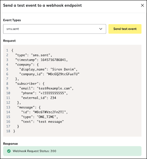 An example payload populates in the Request section. - Click Send test event.