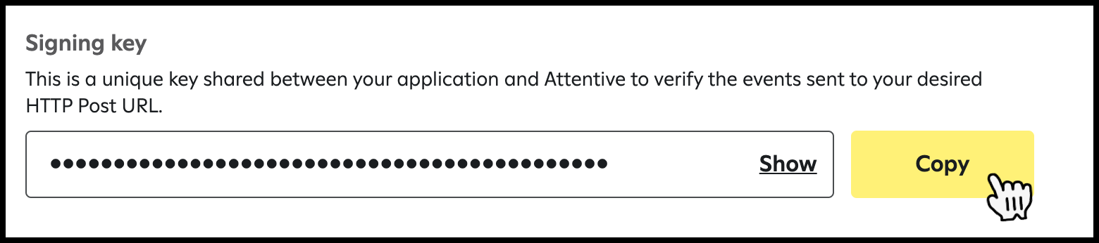 In order to verify signatures, you need to retrieve the signing key of your URL (as shown in the following image) from your dashboard’s webhook settings. See the steps outlined in Create and manage webhooks. Attentive generates a unique client secret for each webhook and signs each request. The following image shows the signing key: